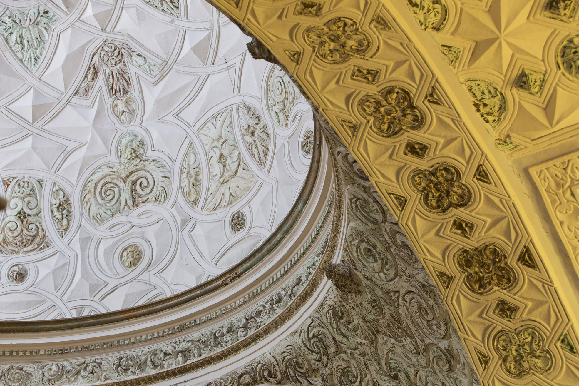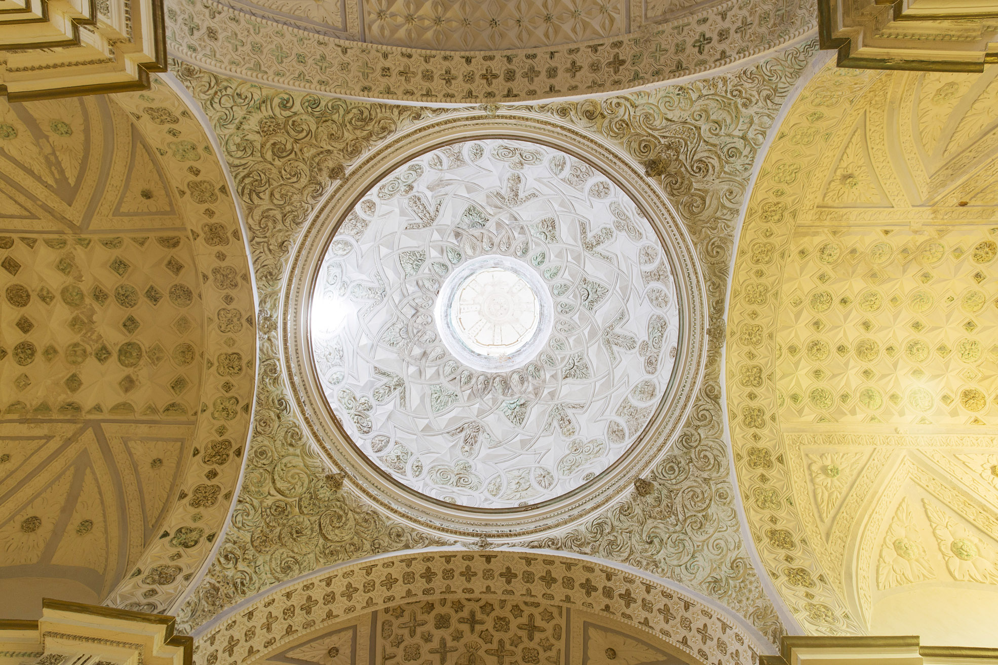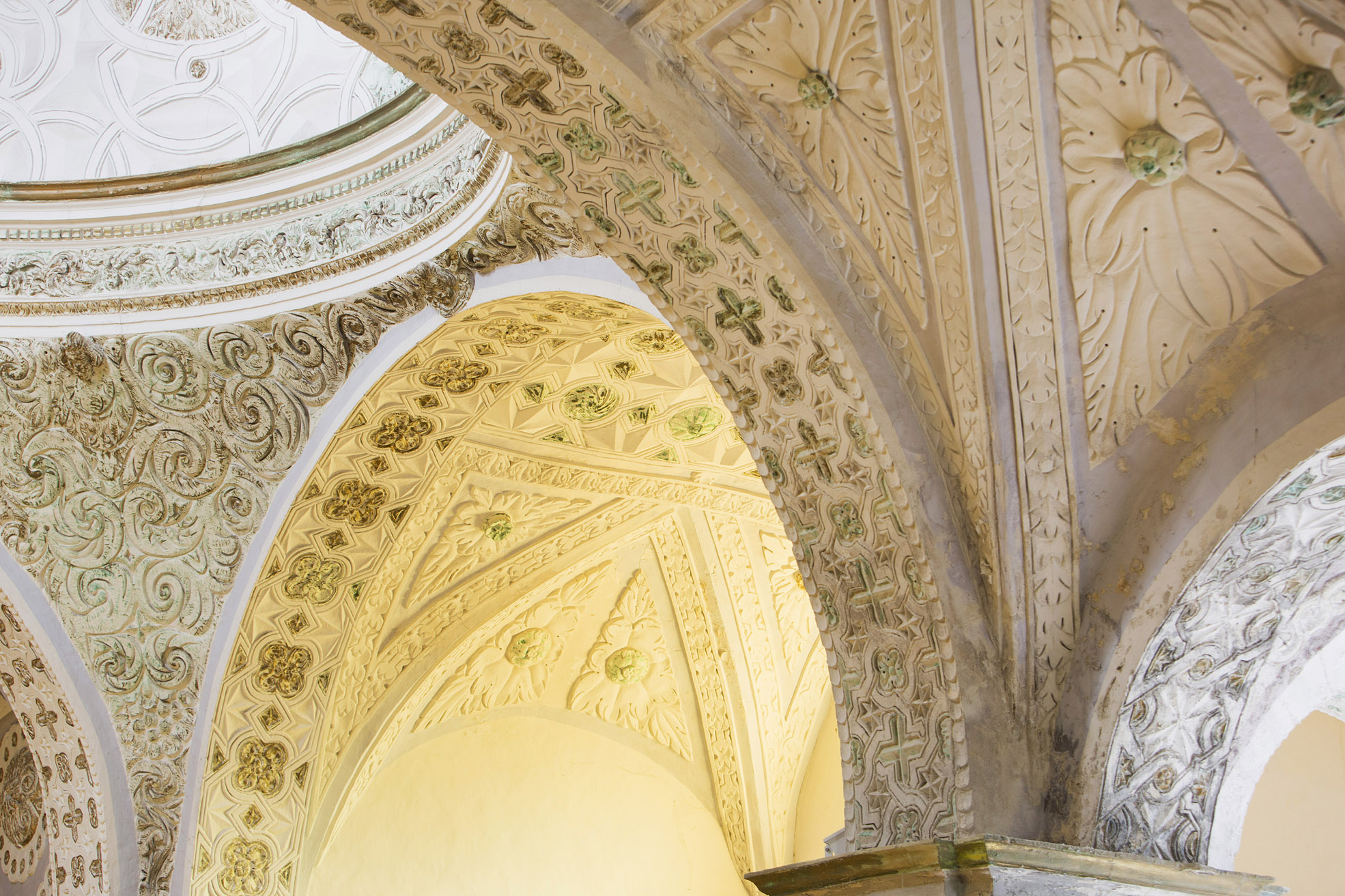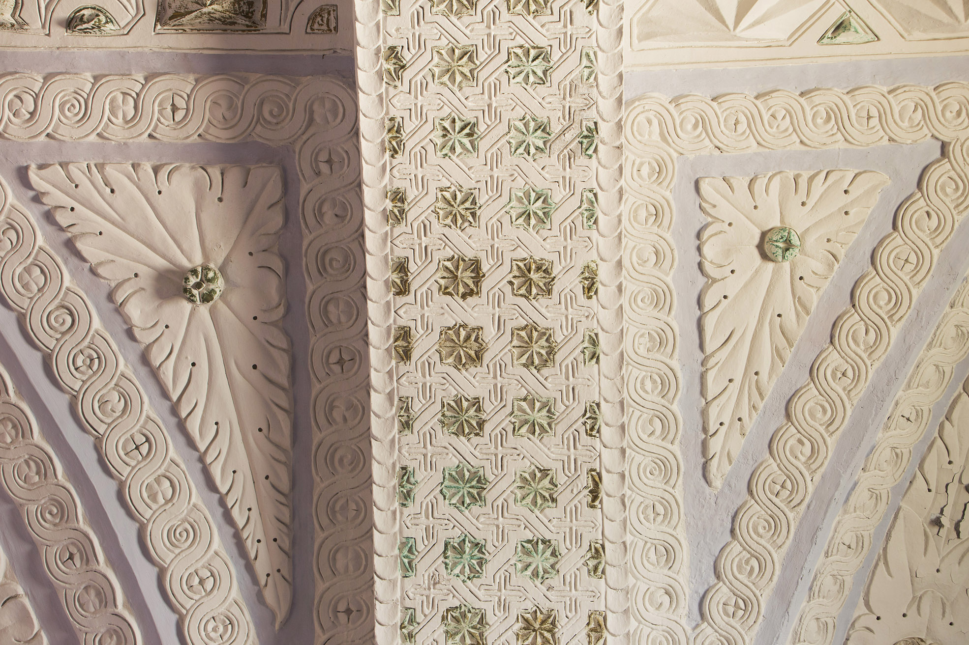 Para esta decoración se ha utilizado los tradicionales motivos de lazo, además de estrellas de ocho puntas y cruces, enmascarando las estructuras arquitectónicas y desmaterializando el espacio.