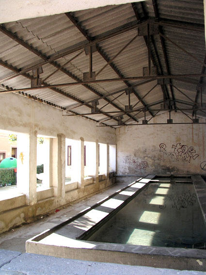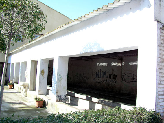 El lavadero presenta estructura rectangular, abierta en su frente largo mediante porche adintelado con pilares prismáticos, y cubierta a dos aguas, sostenido por armazón de hierro.
